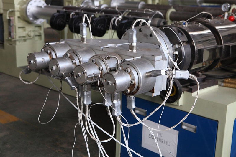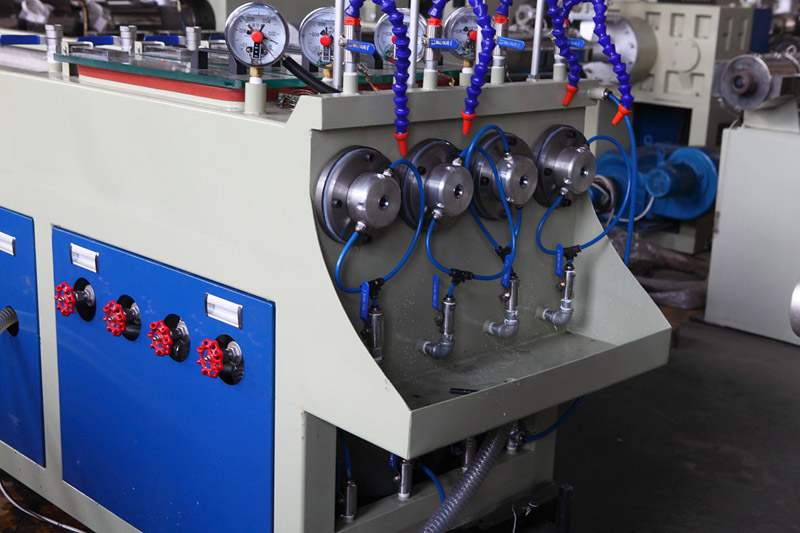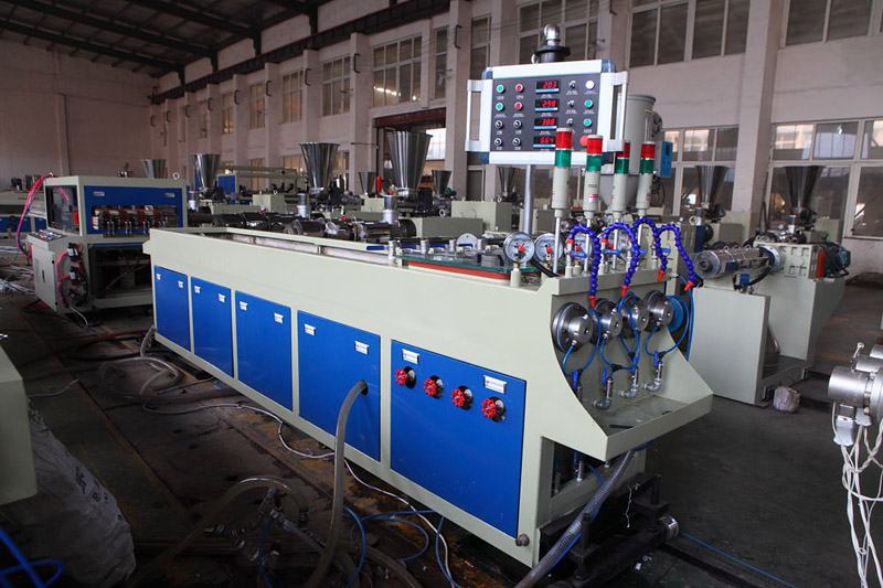 一出四管材線為一次出四條線管、供水管,能大大的降低了單條線管的生產(chǎn)線速度,能使產(chǎn)品在生產(chǎn)品得到很好的冷卻效果,用SJSZ65主機來生產(chǎn),能夠輕松的達到6噸/日。